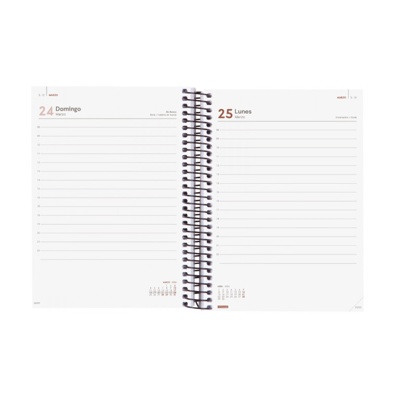 • AMPLIO ESPACIO DE ESCRITURA PARA CADA DÍA, CON HORARIOS DESDE LAS 8:00 HASTA LAS 22:00. PERMITE DETALLAR LOS MINUTOS, POR EJEMPLO: 15:15.