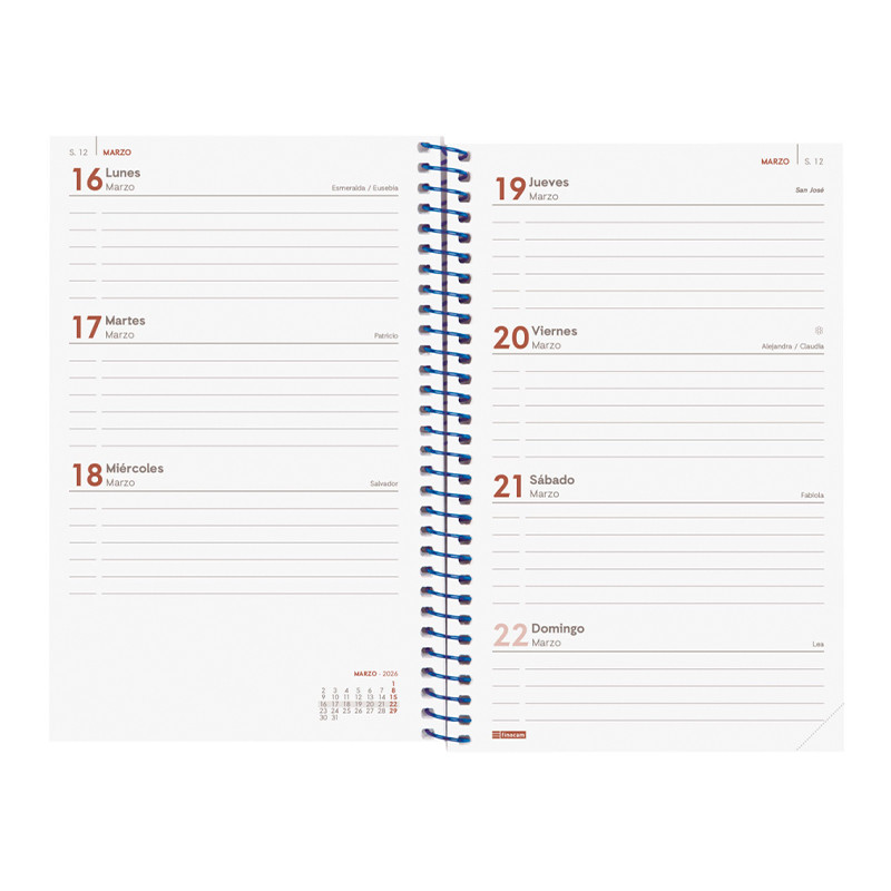 • AMPLIO ESPACIO DE ESCRITURA PARA CADA DÍA, CON ESPACIO PARA CONCRETAR HORARIO.