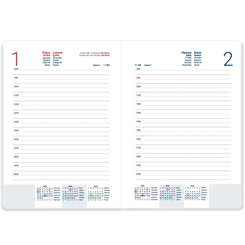 • INCORPORA: DATOS PERSONALES, CALENDARIO TRIENIO Y PERPETUO, PLANNING, SANTORAL, DISTANCIAS KILOMÉTRICAS ENTRE CIUDADES ESPAÑOLAS Y EUROPEAS, HOJAS DE NOTAS, LISTÍN TELEFÓNICO Y MAPA DE ESPAÑA.