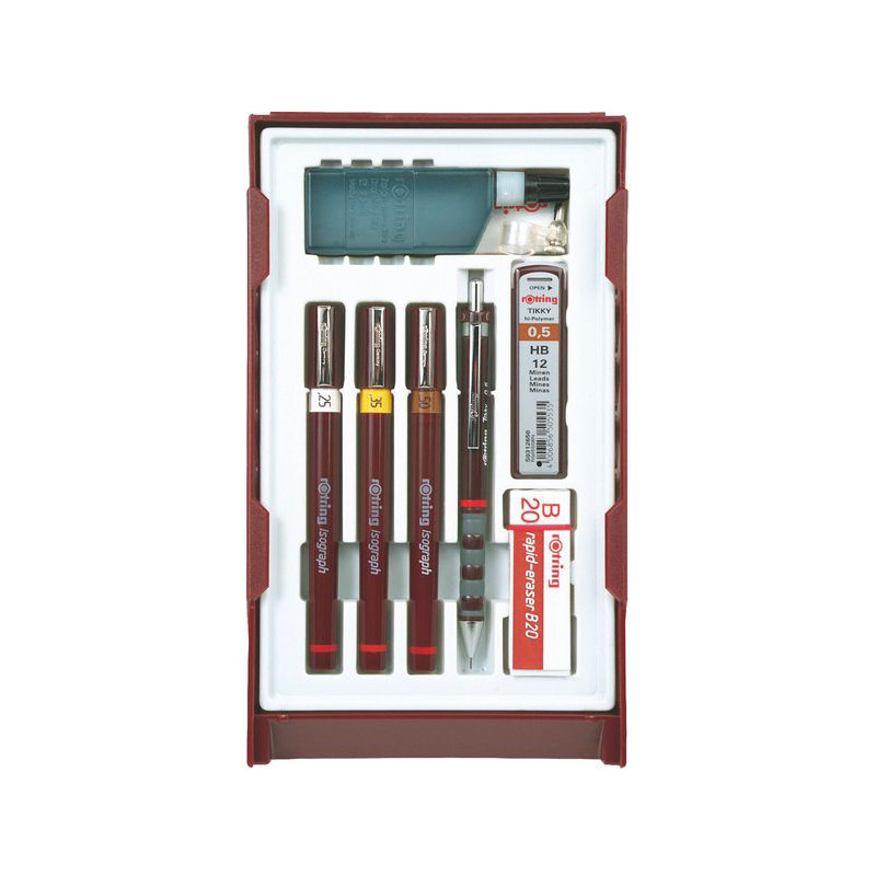 ESTUCHE DE 3 ESTILÓGRAFOS. INCORPORA PEN STATION (SISTEMA DE DISPOSICIÓN DE ESTILÓGRAFOS). INCLUYE ADEMÁS CARTUCHO CAPILAR, PORTAMINAS ROTRING TIKKY II 0,5 MM., GOMA DE BORRAR B20 Y CAJITA DE MINAS HB DE 0,5 MM. Y ADAPTADOR PARA COMPÁS. TAPA MULTIUSOS. ANCHO DE TRAZO: 0,2 - 0,4 - 0,8 MM.