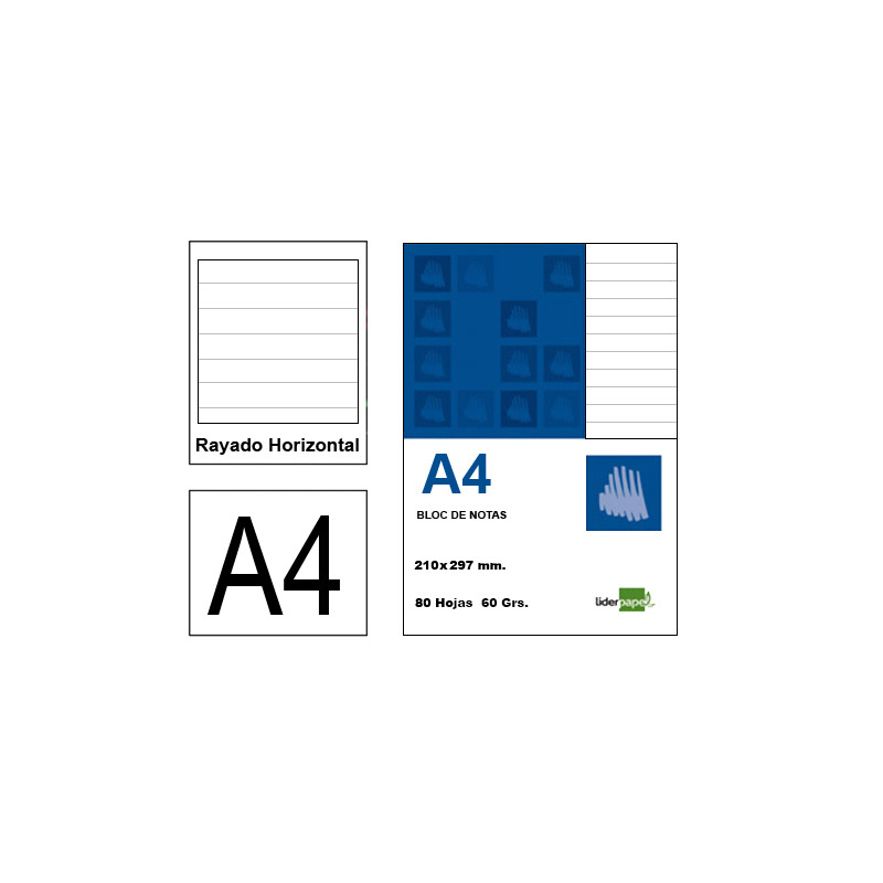 Bloc de notas, lomo encolado, sin perforado, con tapa liderpapel, din a4, 80 hj. 60 grs/m². rayado horizontal 8 mm. s/m.
