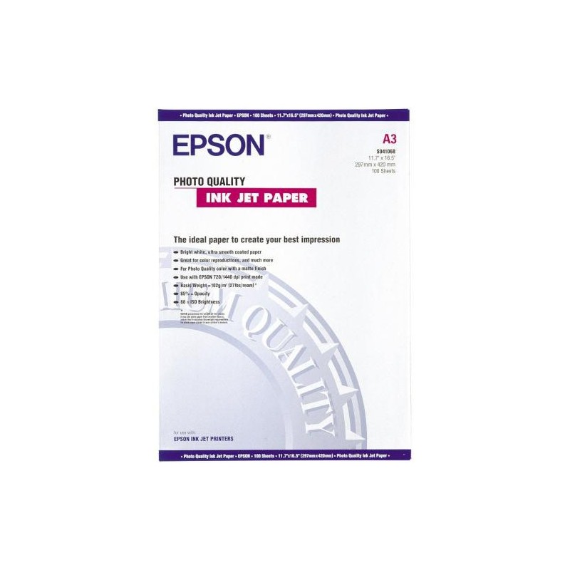 PAQUETE DE 100 HOJAS DE PAPEL EPSON ESPECIAL HQ / PHOTO QUALITY INK-JET PAPER EN DIN A-3 DE 102 GRS. PAPEL MATE DE ALTA OPACIDAD. RESOLUCIÓN 1.440 PPP. MEDIDAS FORMATO DIN A-3 ALTOxANCHO: 297x420 MM.