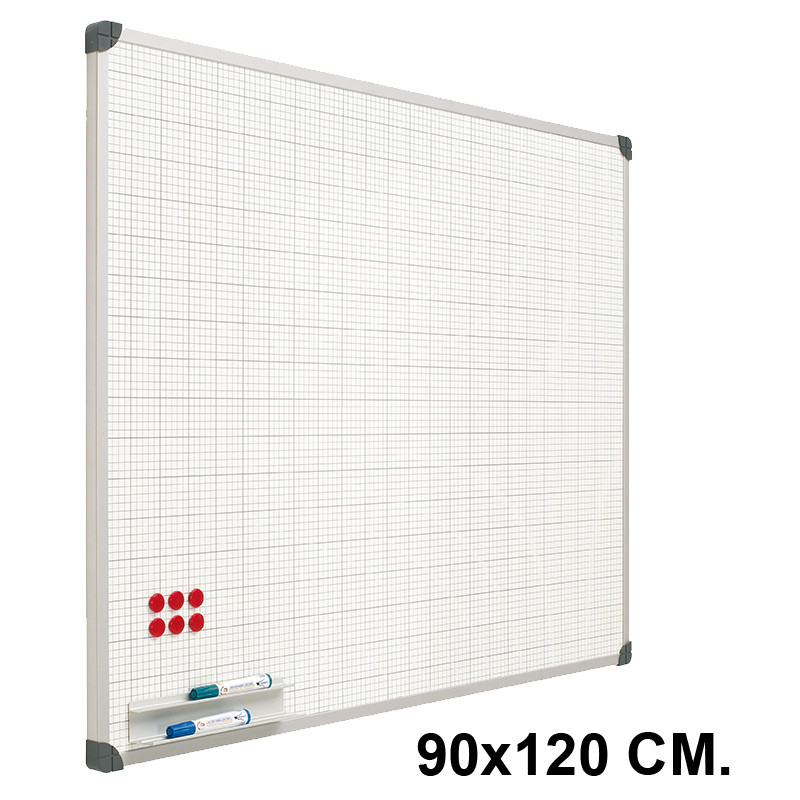 PIZARRA DE ACERO VITRIFICADO BLANCO CON CUADRÍCULA, MARCO DE ALUMINIO ANODIZADO EN PLATA MATE CON CANTONERAS REDONDEADAS DE PLÁSTICO GRIS PLANNING SISPLAMO.